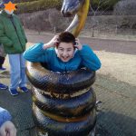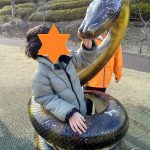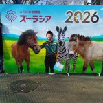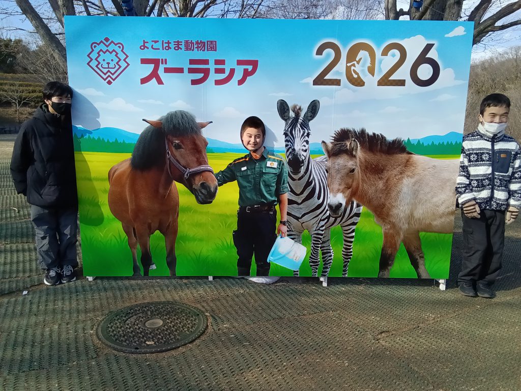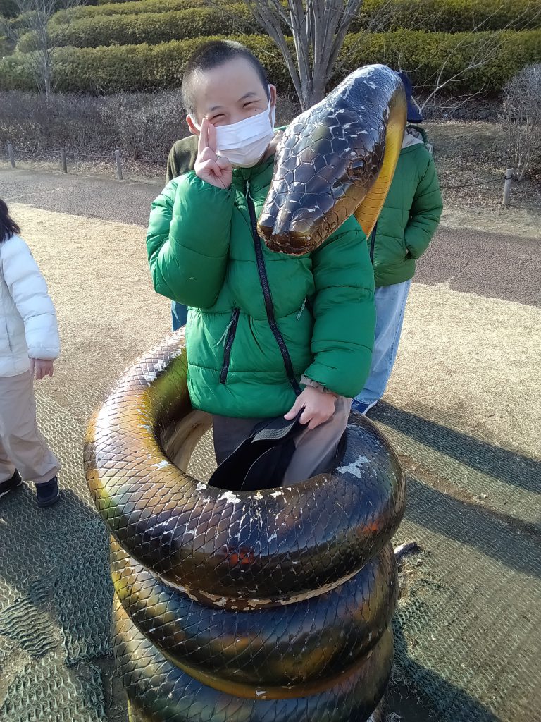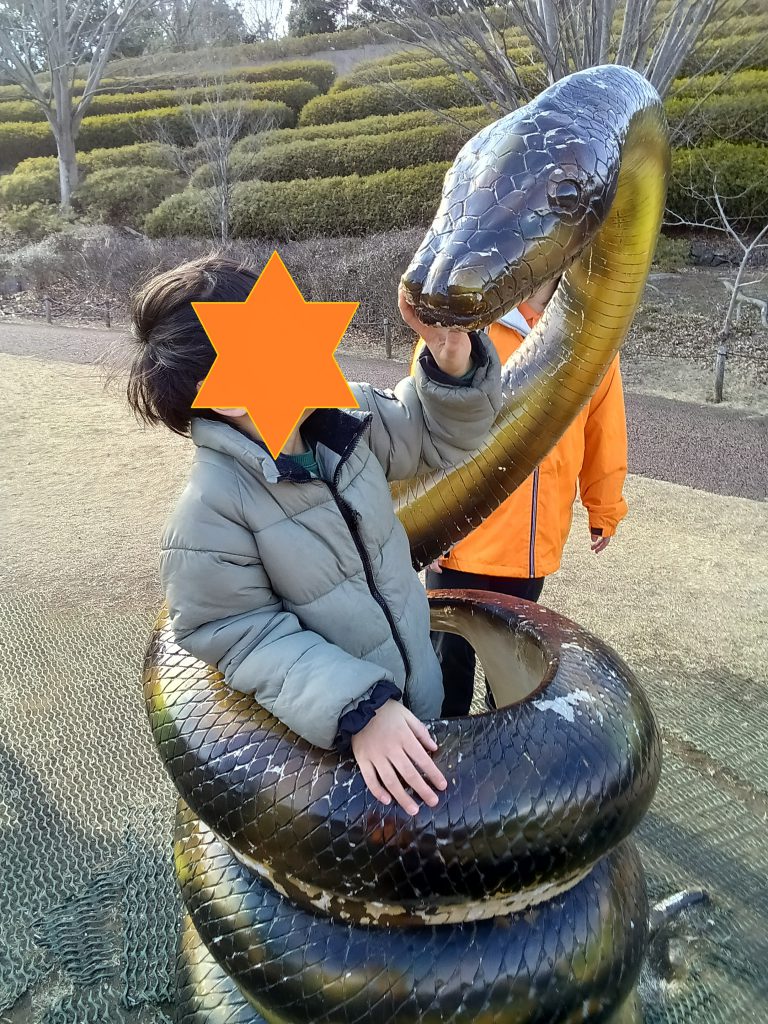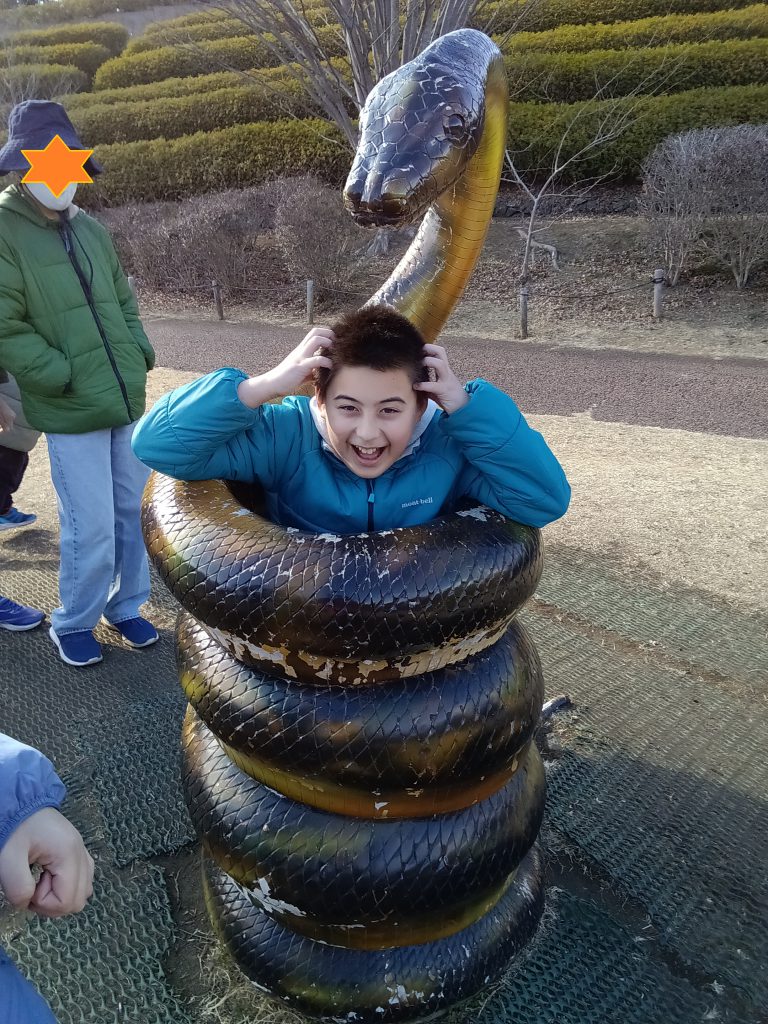 2026年の記念パネルや、ヘビのオブジェで思いっきりポーズ🐍