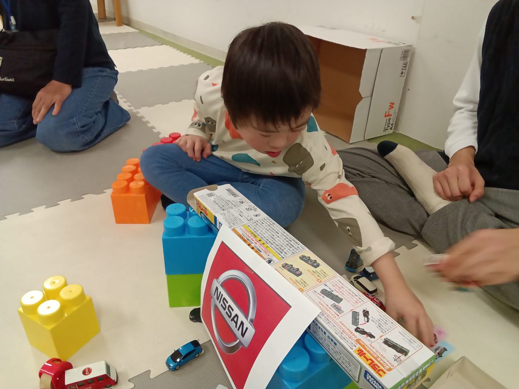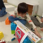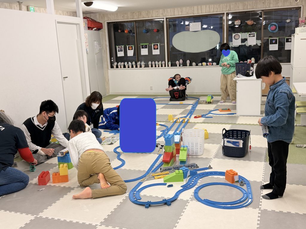 いつも自由時間に男の子たちが遊んでいるプラレールを使って、電車が走る街を再現する活動を行いました。