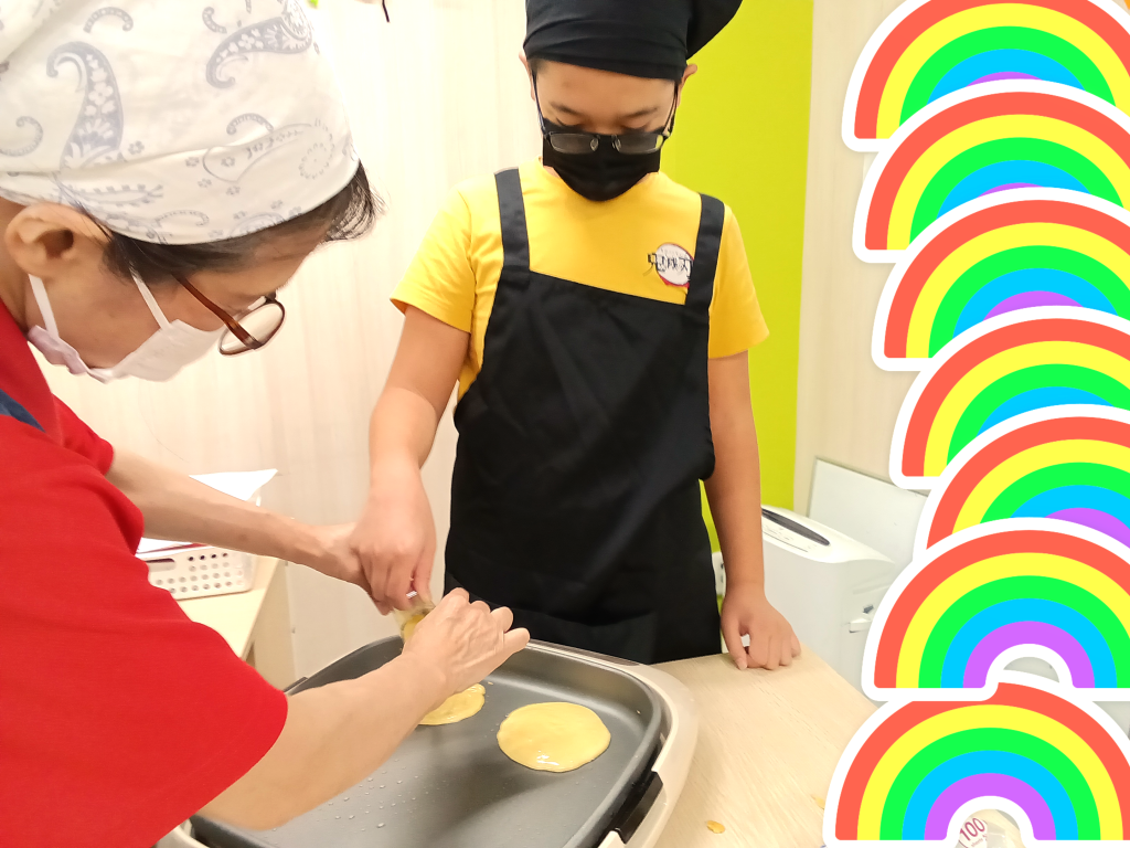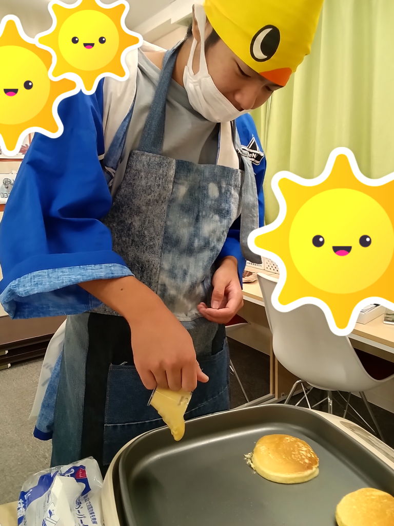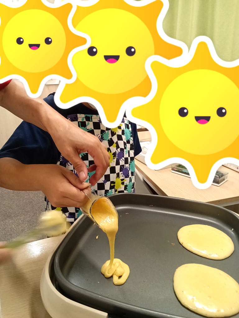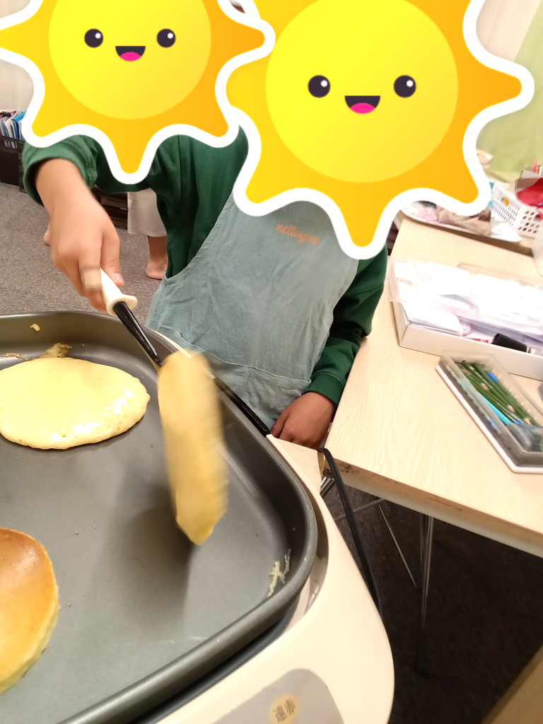 フライ返しでひっくり返す緊張の瞬間です!! 先生手伝って!という児童もいれば、自分でやってみる!とチャレンジする児童など様々です😊気持ちに寄り添ってフォローやアドバイスを行いました。