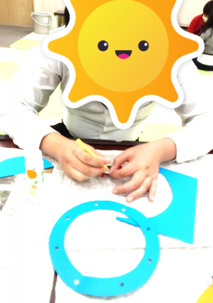色画用紙を線に沿って丸くハサミで切り、穴をパンチで開けていきます。ハサミを上手に使え