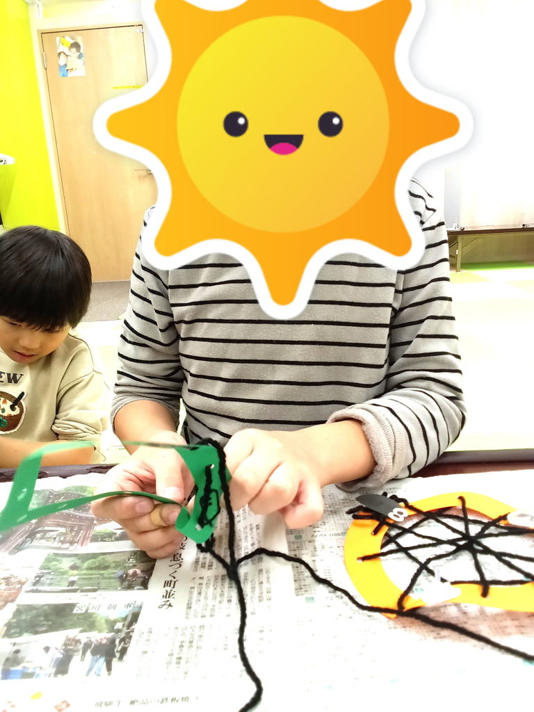 毛糸を通した後は虫に目を書いて、ハロウィン🎃らしいコウモリ🦇や月夜の十字架✝等の描かれた絵を貼って出来上がりです😃