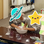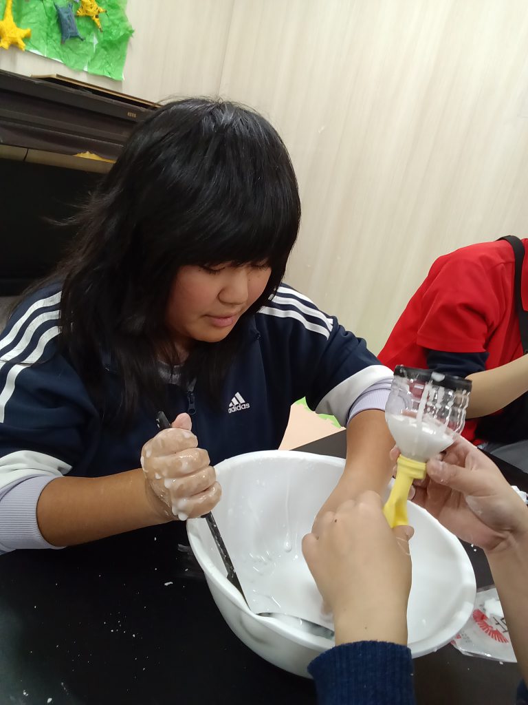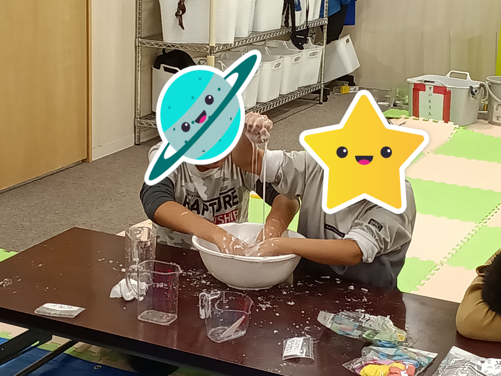 固いような、やわらかいようなドロドロの液体。指でゆっくり押すと柔らかく、強く押すと固い感じになるのがとても面白いようで子ども達も楽しんでいました。