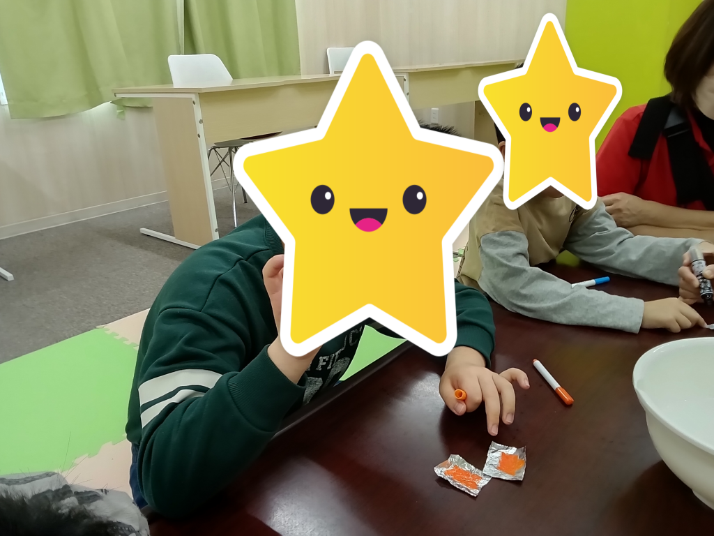 小さなアルミホイルに絵を描くのは難しいです!頑張ってかいていました。