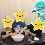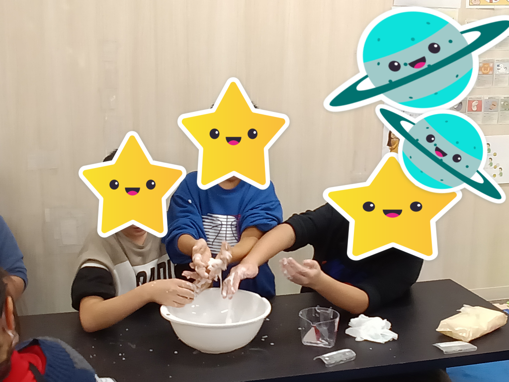片栗粉の感触やトロトロになったり固まったりする不思議な現象を、実際に片栗粉と水を混ぜながら感じられる体験をしました。