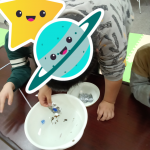 ①グループは「水に浮かぶ絵」・・・・ボウルに水を入れて、水性ペンで絵を描くと水に絵が浮かびあがる不思議な絵!!