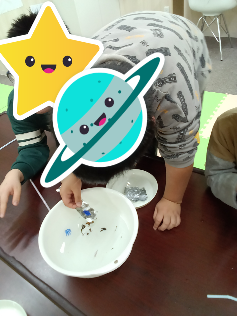 <アルミホイルに絵を描いてるよ!> <小さいなあ・・・>   <小さく描くの難しいなあ>    <そ~っと水に入れて…>