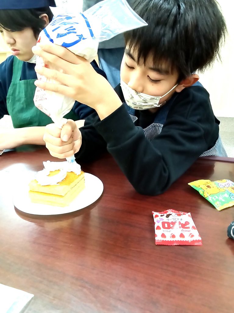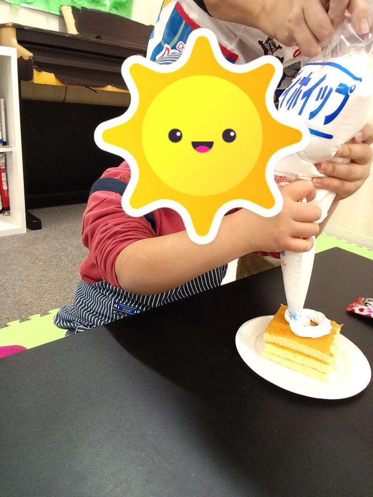 1人分にカットしたスポンジケーキに生クリームをのせていきます。クリームをスプーンで伸ばしていく子どもや絞ったままの形を残す子どもなど、それぞれの子どもたちの頭の中で描いた完成図に少しずつ近づくよう、楽しんでいる様子がうかがえました😄